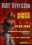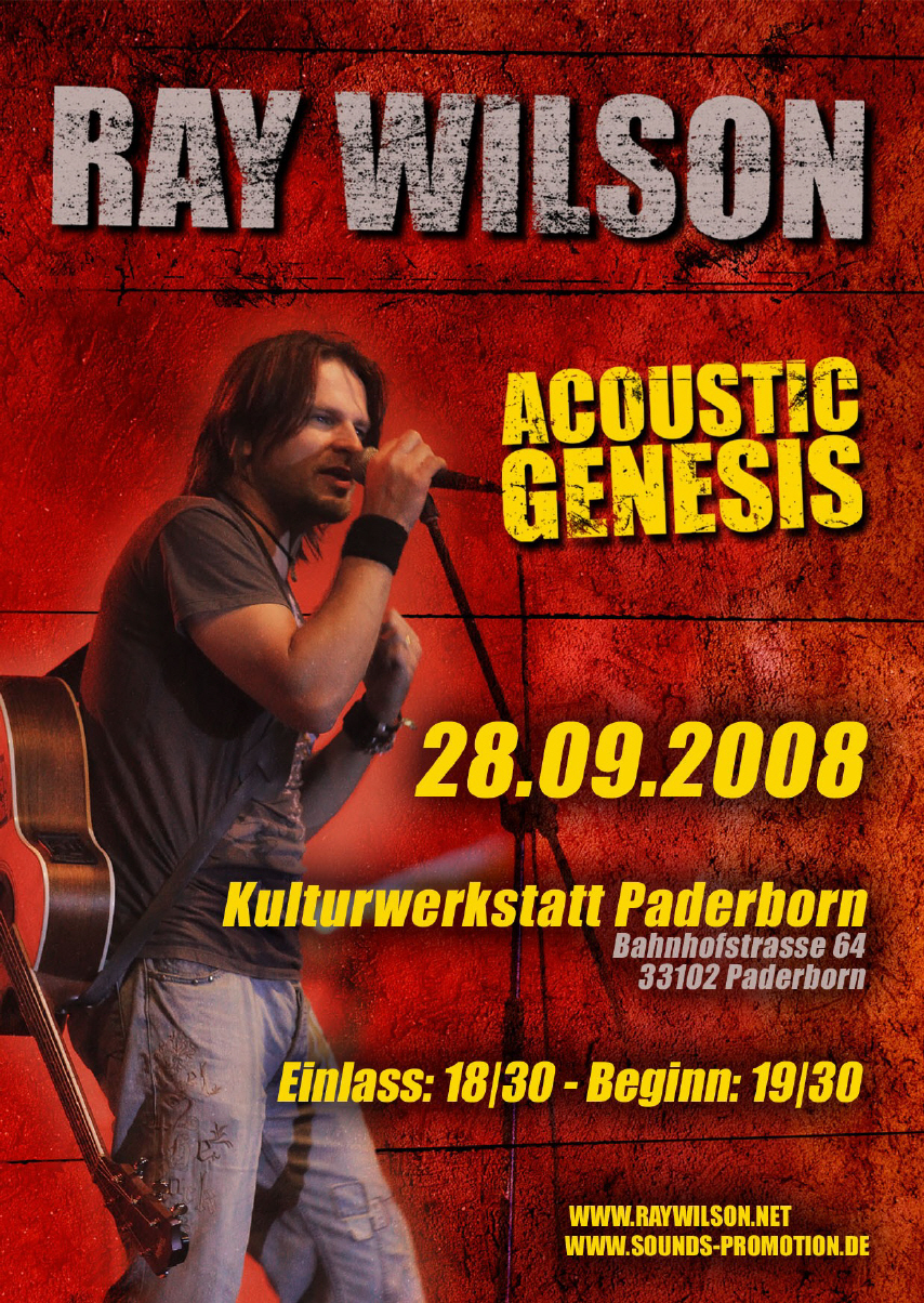 Wir holen den Stiltskin und Ex-Genesis Sänger Ray Wilson nach Paderborn! RAY WILSON - “Songs from the World of Genesis and his Solo Career” Weltweit bekannt geworden, ist der Schotte Ray Wilson als Sänger der britischen Grunge - Sensation Stiltskin, vor allem aber als Mitglied der Rocklegende Genesis, mit der er 1997 das Album ‚Calling All Stations’ einspielte. Begleitet von seinem Freund, dem Gitarristen Ali Ferguson kommt Ray Wilson am Sonntag ,den 28.09.2008 um 19:30 Uhr zu einem Sonderkonzert „Acoustic Genesis“ nach Paderborn in die Kulturwerkstatt! Ray Wilson, ist ein sympathischer Ausnahmesänger und mit seiner charismatischen Bühnenpräsenz als exzellenter Entertainer bekannt. Auf der Setliste stehen natürlich alte Genesis-Nummern. Ausdrucksstark, kräftig, rau wie Schmirgelpapier, aber doch einfühlsam sanft. Er wird mit akustischer Gitarrenbegleitung Hits aus der Rock Legenden Ära präsentieren. Dazu zählen Titel wie ‘Follow me Follow you’ ‚ Shipwrecked’, ‚Not About Us’, ‚Carpet Crawlers’, ‚Congo’ und ‚ Biko’ . Aber auch einige persönliche Favoriten, die seine musikalische Laufbahn beeinflusst haben, wie David Bowie (Space Oddity ) , Bruce Springsteen (´The River`) oder Bob Dylan (´Knocking On Heaven’t s Door `) wird Ray Wilson in seiner Songauswahl für sein anspruchsvolles Publikum bereithalten. Ray Wilson kombiniert die Energie des Rock mit komplexen Songwriting und verspricht ein leidenschaftliches, erstklassiges Akustik-Konzerterlebnis der Premiumklasse ! |
